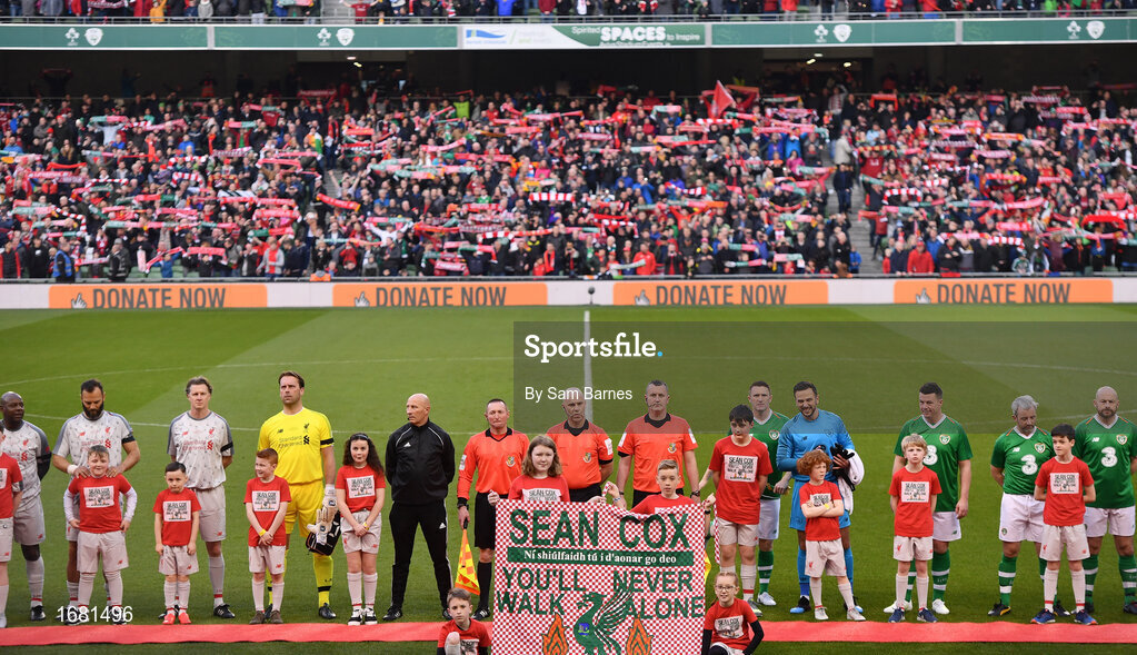 12 April 2019; The two teams and mascots line up prior to the Sean Cox Fundraiser match between the Republic of Ireland XI and Liverpool FC Legends at the Aviva Stadium in Dublin. Photo by Sam Barnes/Sportsfile