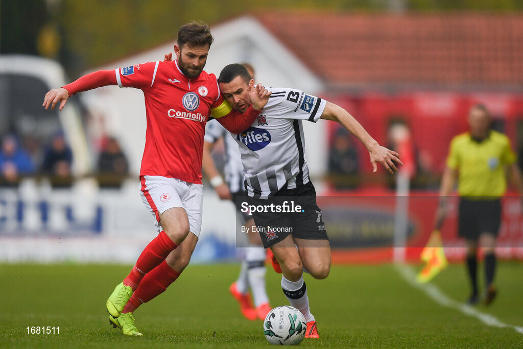 12 April 2019; Michael Duffy of Dundalk in action against Kyle Callan-McFadden of Sligo Rovers during the SSE Airtricity League Premier Division match between Sligo Rovers and Dundalk at The Showgrounds in Sligo. Photo by Eóin Noonan/Sportsfile