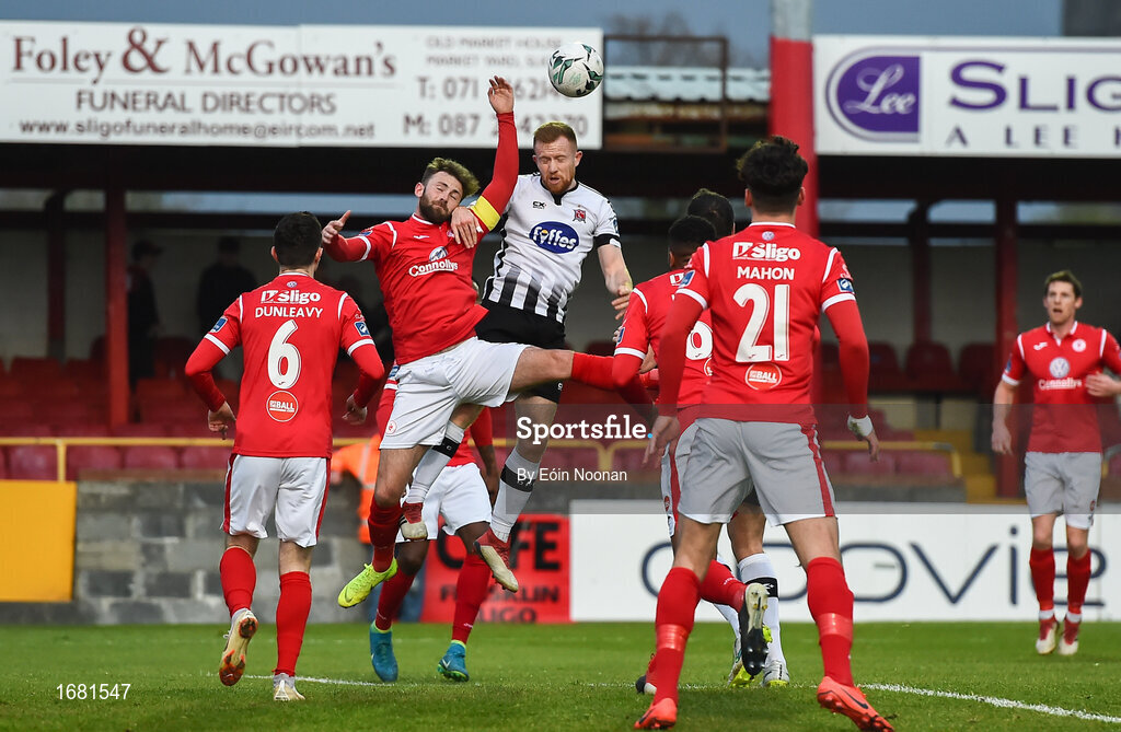 12 April 2019; Kyle Callan-McFadden of Sligo Rovers handles the ball in the box resulting in a penalty being awarded to Dundalk during the SSE Airtricity League Premier Division match between Sligo Rovers and Dundalk at The Showgrounds in Sligo. Photo by Eóin Noonan/Sportsfile