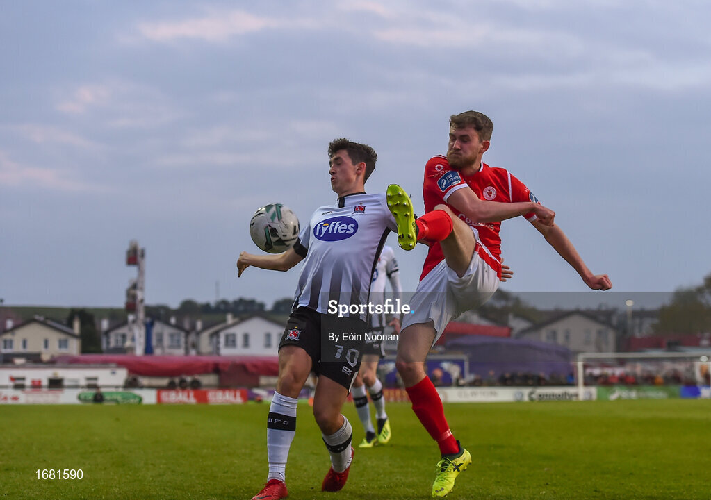 12 April 2019; Lewis Banks of Sligo Rovers in action against Jamie McGrath of Dundalk during the SSE Airtricity League Premier Division match between Sligo Rovers and Dundalk at The Showgrounds in Sligo. Photo by Eóin Noonan/Sportsfile