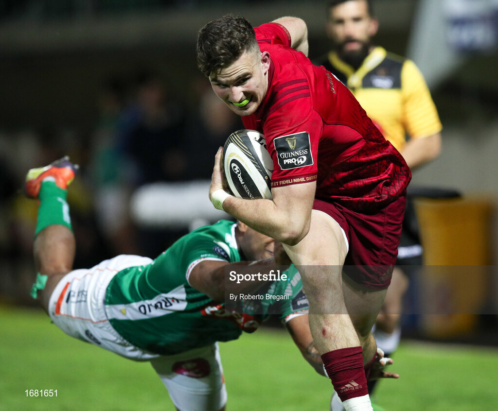 12 April 2019; Shane Daly of Munster scores a try despite the tackle of Dewaldt Duvenage of Benetton Treviso during the Guinness PRO14 Round 20 game between Benetton Treviso and Munster Rugby at Stadio di Monigo in Treviso, Italy. Photo by Roberto Bregani/Sportsfile