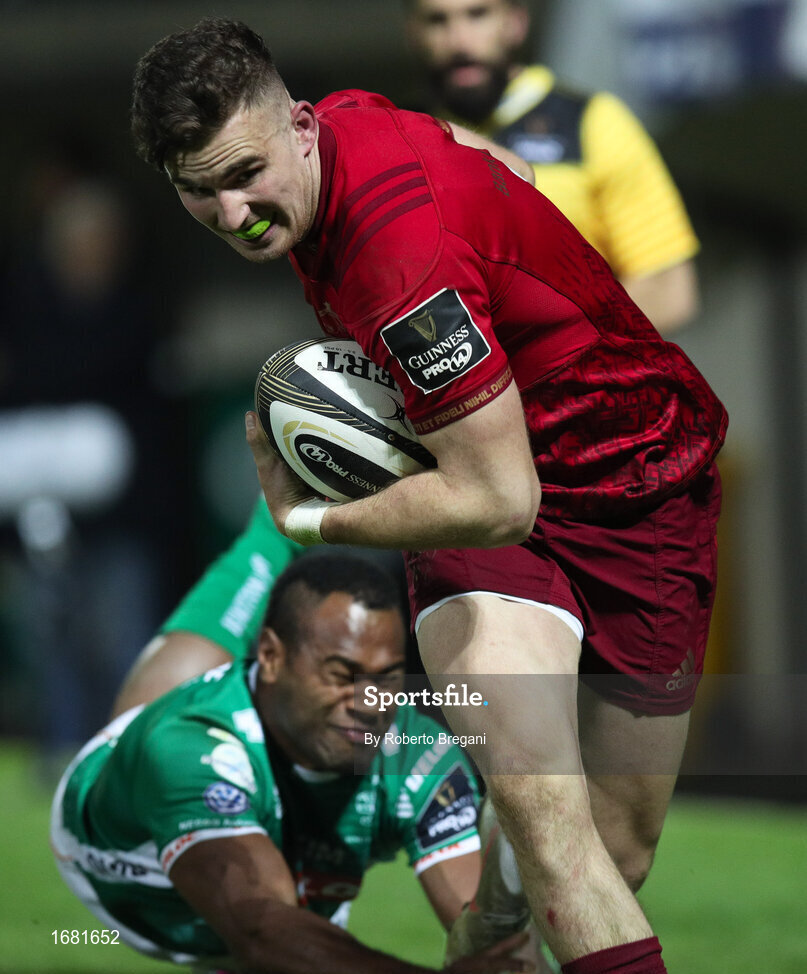 12 April 2019; Shane Daly of Munster scores a try despite the tackle of Dewaldt Duvenage of Benetton Treviso during the Guinness PRO14 Round 20 game between Benetton Treviso and Munster Rugby at Stadio di Monigo in Treviso, Italy. Photo by Roberto Bregani/Sportsfile
