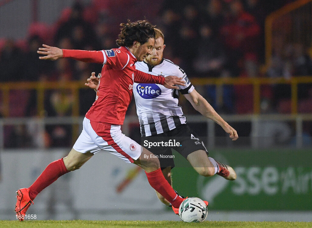 12 April 2019; Ronan Coughlan of Sligo Rovers is tackled by Seán Hoare of Dundalk during the SSE Airtricity League Premier Division match between Sligo Rovers and Dundalk at The Showgrounds in Sligo. Photo by Eóin Noonan/Sportsfile