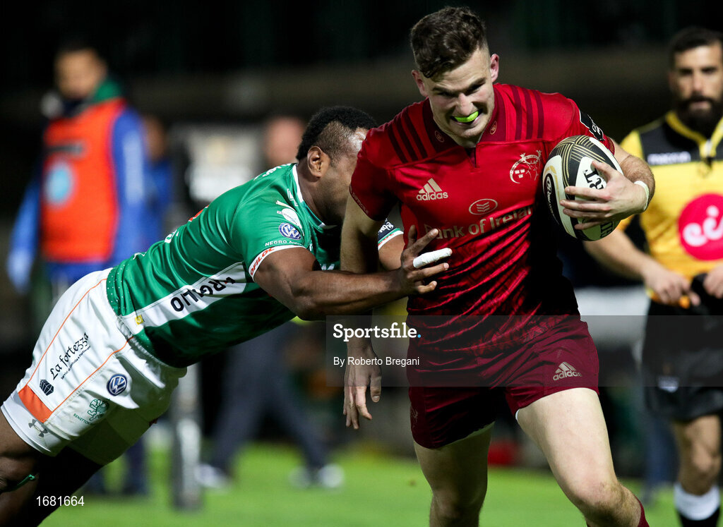 12 April 2019; Shane Daly of Munster goes over Dewaldt Duvenage of Benetton Treviso to score try during the Guinness PRO14 Round 20 game between Benetton Treviso and Munster Rugby at Stadio di Monigo in Treviso, Italy. Photo by Roberto Bregani/Sportsfile