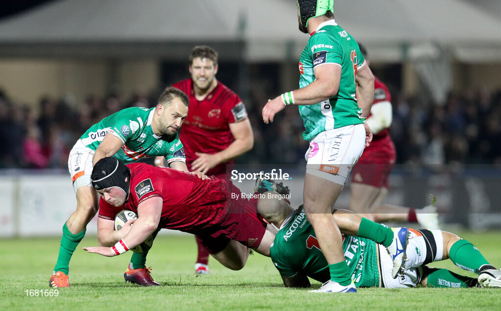 12 April 2019; Ciaran Parker of Munster is tackled by Marco Lazzaroni of Benetton Treviso during the Guinness PRO14 Round 20 game between Benetton Treviso and Munster Rugby at Stadio di Monigo in Treviso, Italy. Photo by Roberto Bregani/Sportsfile