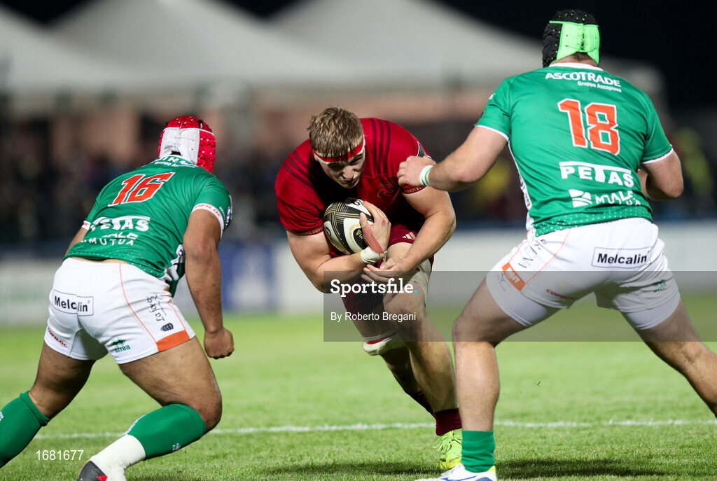 12 April 2019; Gavin Coombes of Munster takes on Simone Ferrari of Benetton Treviso and Hame Faiva of Benetton Treviso during the Guinness PRO14 Round 20 game between Benetton Treviso and Munster Rugby at Stadio di Monigo in Treviso, Italy. Photo by Roberto Bregani/Sportsfile