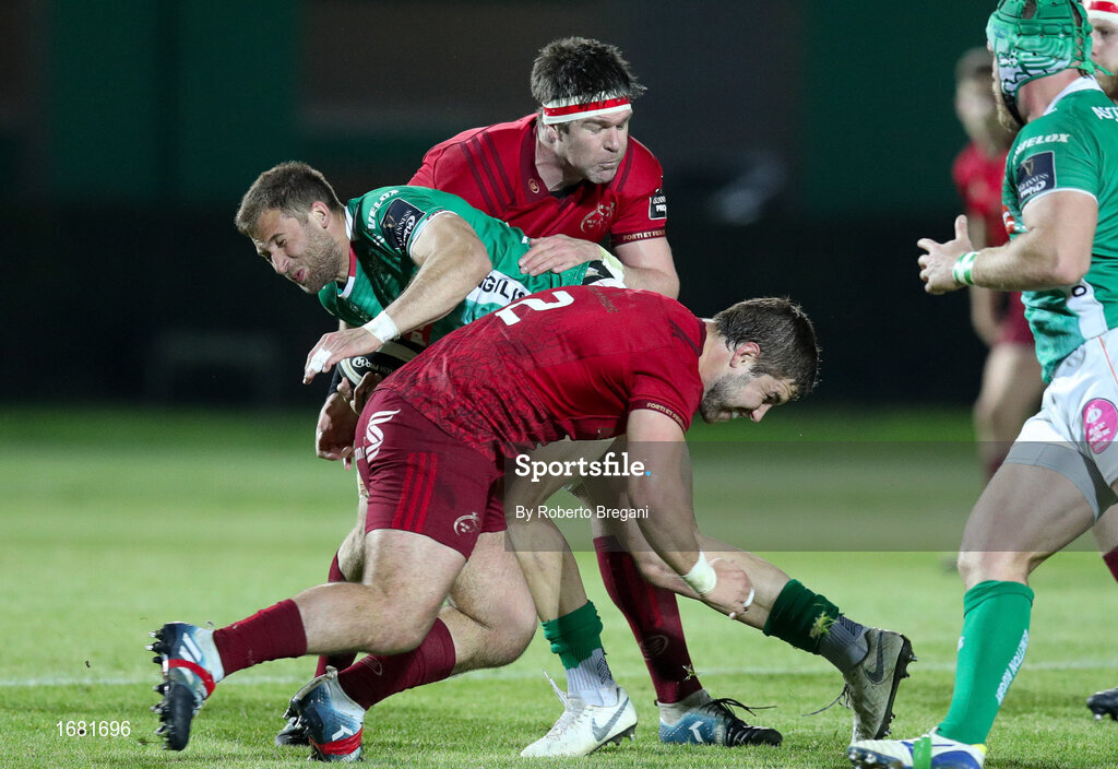 12 April 2019; Marco Zanon of Benetton Treviso is tackled by Billy Holland and Rhys Marshall of Munster during the Guinness PRO14 Round 20 game between Benetton Treviso and Munster Rugby at Stadio di Monigo in Treviso, Italy. Photo by Roberto Bregani/Sportsfile