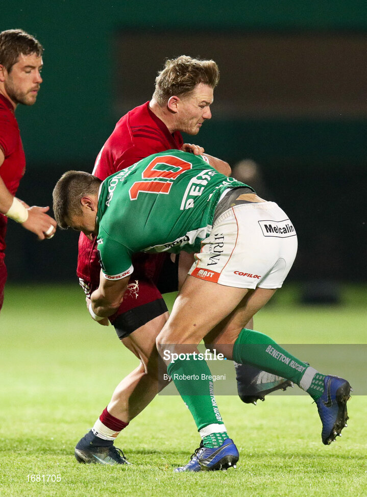 12 April 2019; Chris Cloete of Munster Rugby is tackled by Tommaso Allan of Benetton Treviso during the Guinness PRO14 Round 20 game between Benetton Treviso and Munster Rugby at Stadio di Monigo in Treviso, Italy. Photo by Roberto Bregani/Sportsfile