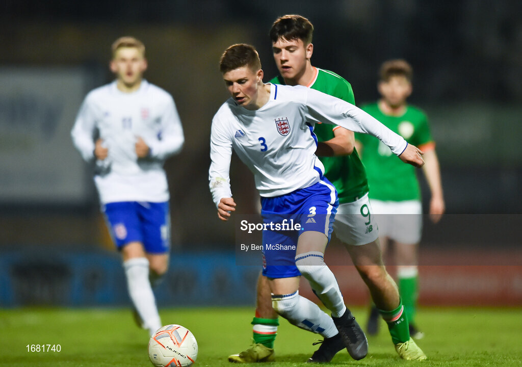 12 April 2019; Carter Lycett of England in action against Jake Ellis of Republic of Ireland during the SAFIB Centenary Shield Under 18 Boys' International match between Republic of Ireland and England at Dalymount Park in Dublin. Photo by Ben McShane/Sportsfile