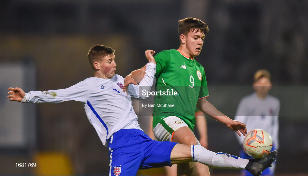 12 April 2019; Jake Ellis of Republic of Ireland in action against Carter Lycett of England during the SAFIB Centenary Shield Under 18 Boys' International match between Republic of Ireland and England at Dalymount Park in Dublin. Photo by Ben McShane/Sportsfile