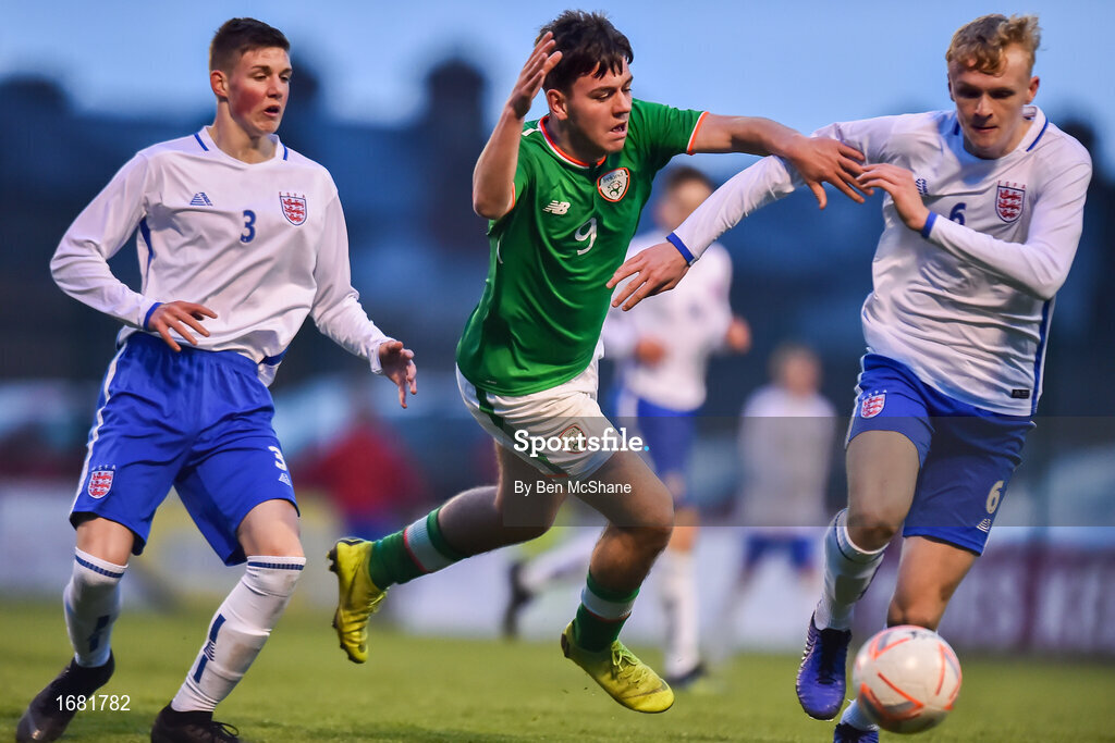 12 April 2019; Jake Ellis of Republic of Ireland in action against Carter Lycett, left, and Connor Taylor of England during the SAFIB Centenary Shield Under 18 Boys' International match between Republic of Ireland and England at Dalymount Park in Dublin. Photo by Ben McShane/Sportsfile