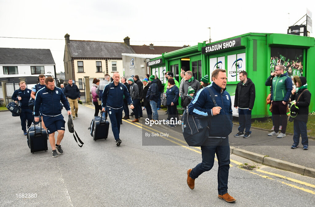 13 April 2019; Cardiff Blues head coach John Mulvihill, right, arrives with his team prior to the Guinness PRO14 Round 20 match between Connacht and Cardiff Blues at The Sportsground in Galway. Photo by Seb Daly/Sportsfile