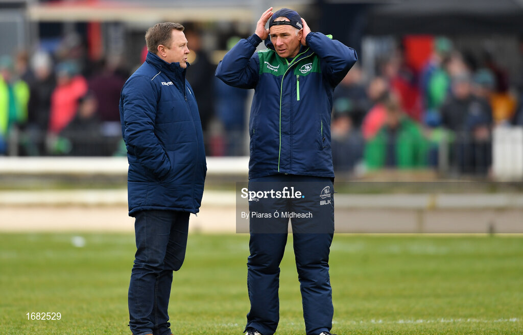 13 April 2019; Cardiff Blues head coach John Mulvihill, left, speaking with Connacht head coach Andy Friend before the Guinness PRO14 Round 20 match between Connacht and Cardiff Blues at The Sportsground in Galway. Photo by Piaras Ó Mídheach/Sportsfile