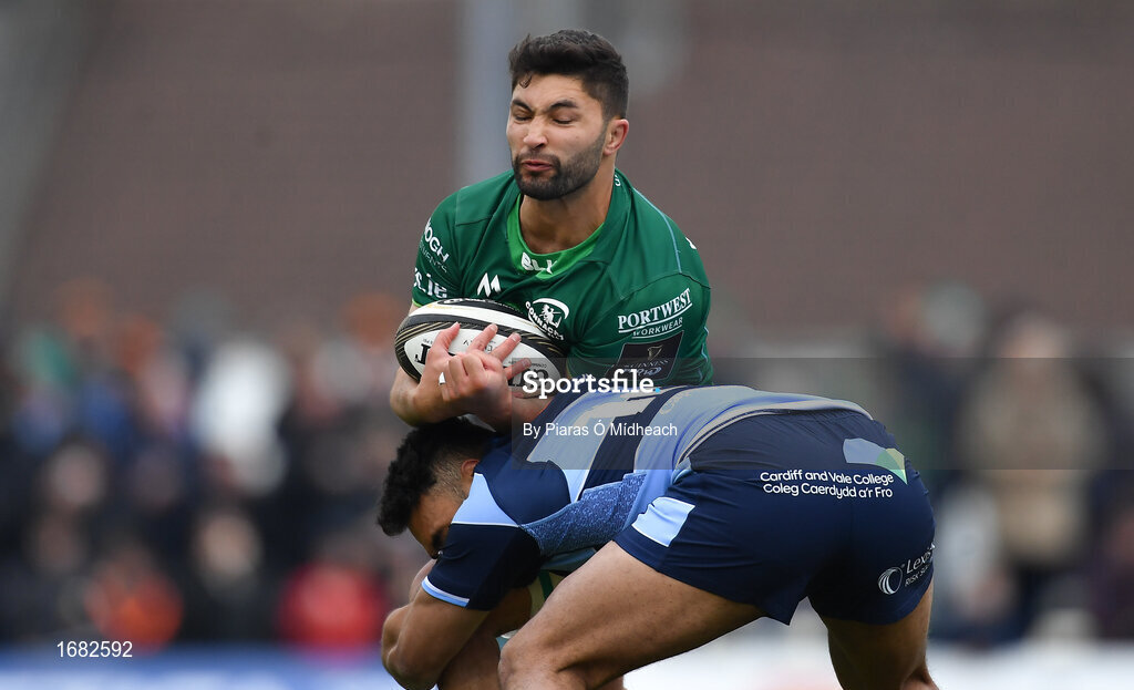 13 April 2019; Colby Fainga’a of Connacht is tackled by Willis Halaholo of Cardiff Blues during the Guinness PRO14 Round 20 match between Connacht and Cardiff Blues at The Sportsground in Galway. Photo by Piaras Ó Mídheach/Sportsfile