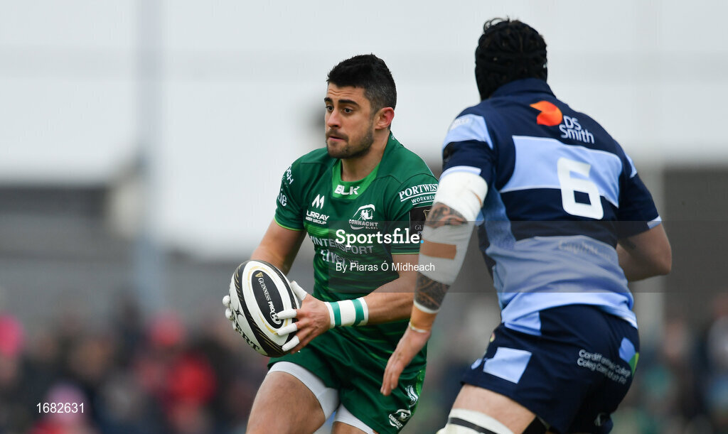13 April 2019; Tiernan O’Halloran of Connacht in action against Josh Turnbull of Cardiff Blues during the Guinness PRO14 Round 20 match between Connacht and Cardiff Blues at The Sportsground in Galway. Photo by Piaras Ó Mídheach/Sportsfile
