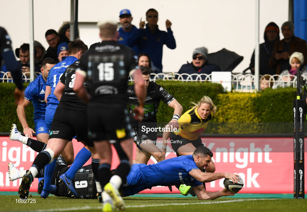 13 April 2019; Rob Kearney of Leinster goes over to score his side's third try during the Guinness PRO14 Round 20 match between Leinster and Glasgow Warriors at the RDS Arena in Dublin. Photo by Stephen McCarthy/Sportsfile