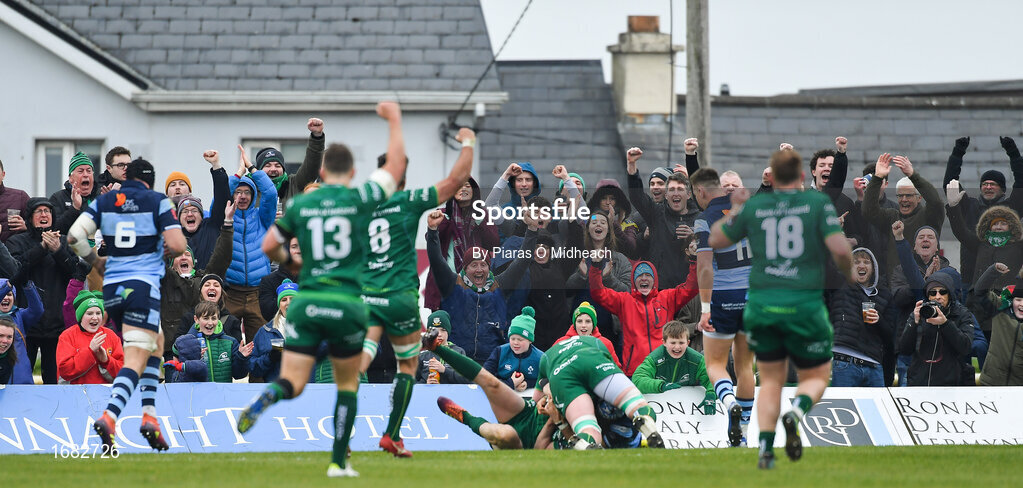 13 April 2019; Connacht supporters celebrate their third try, scored by Jack Carty, during the Guinness PRO14 Round 20 match between Connacht and Cardiff Blues at The Sportsground in Galway. Photo by Piaras Ó Mídheach/Sportsfile