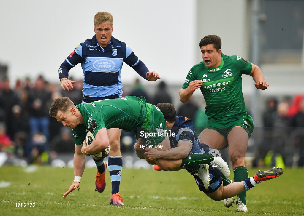 13 April 2019; Matt Healy of Connacht is tackled by Tomos Williams of Cardiff Blues during the Guinness PRO14 Round 20 match between Connacht and Cardiff Blues at The Sportsground in Galway. Photo by Seb Daly/Sportsfile