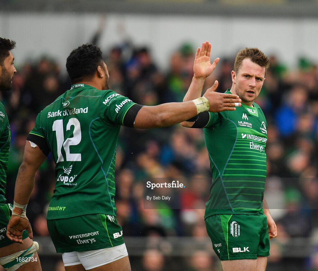 13 April 2019; Jack Carty of Connacht, right, is congratulated by team-mate Bundee Aki after scoring his side's third try during the Guinness PRO14 Round 20 match between Connacht and Cardiff Blues at The Sportsground in Galway. Photo by Seb Daly/Sportsfile