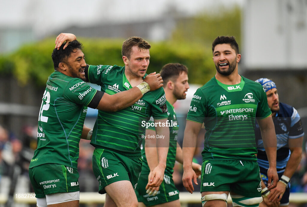 13 April 2019; Jack Carty of Connacht, centre, is congratulated by team-mate Bundee Aki after scoring his side's third try during the Guinness PRO14 Round 20 match between Connacht and Cardiff Blues at The Sportsground in Galway. Photo by Seb Daly/Sportsfile