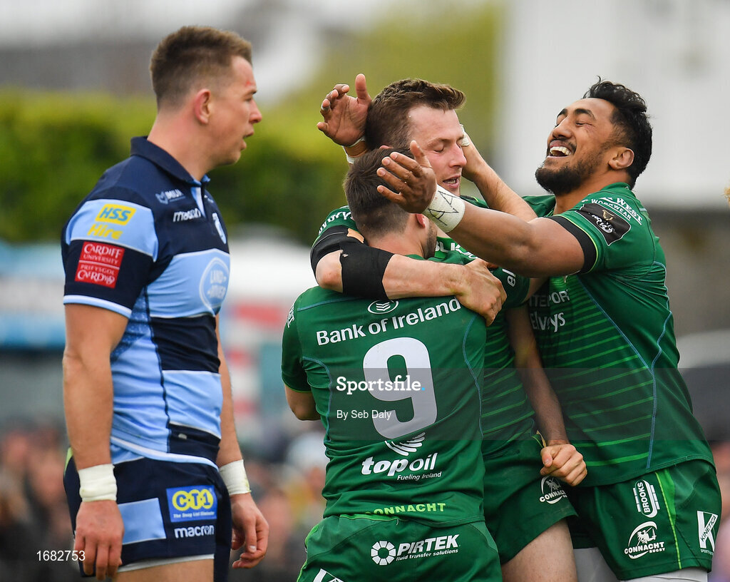 13 April 2019; Jack Carty of Connacht, centre, is congratulated by team-mates Caolin Blade and Bundee Aki after scoring his side's third try during the Guinness PRO14 Round 20 match between Connacht and Cardiff Blues at The Sportsground in Galway. Photo by Seb Daly/Sportsfile