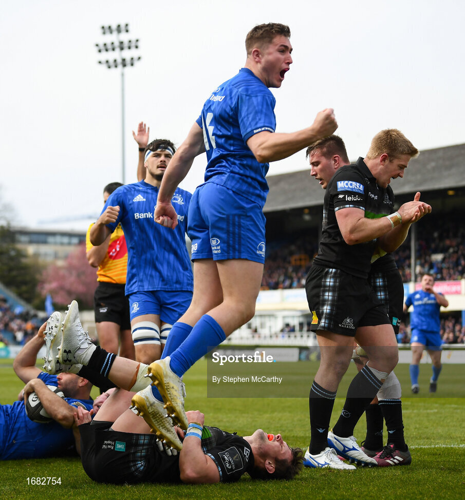 13 April 2019; Jordan Larmour celebrates after his Leinster team-mate Dave Kearney scored their side's fourth try during the Guinness PRO14 Round 20 match between Leinster and Glasgow Warriors at the RDS Arena in Dublin. Photo by Stephen McCarthy/Sportsfile