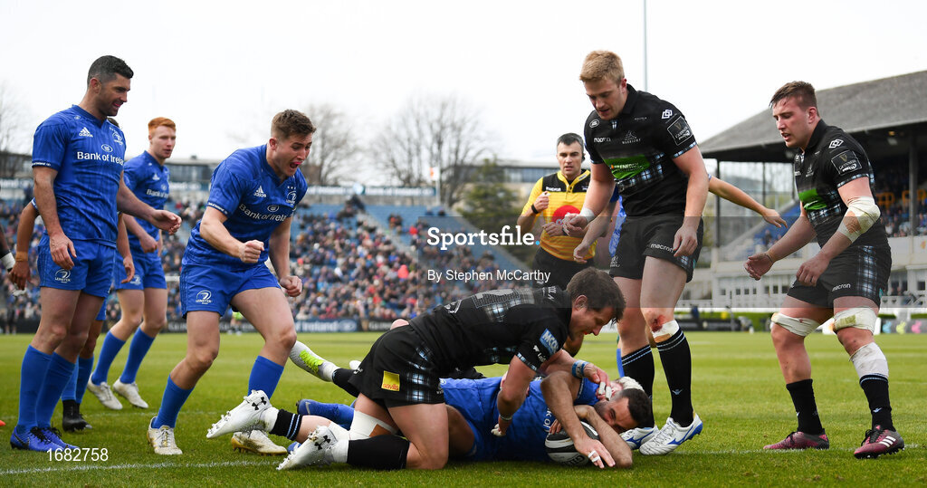 13 April 2019; Dave Kearney of Leinster goes over to score his side's fourth try during the Guinness PRO14 Round 20 match between Leinster and Glasgow Warriors at the RDS Arena in Dublin. Photo by Stephen McCarthy/Sportsfile