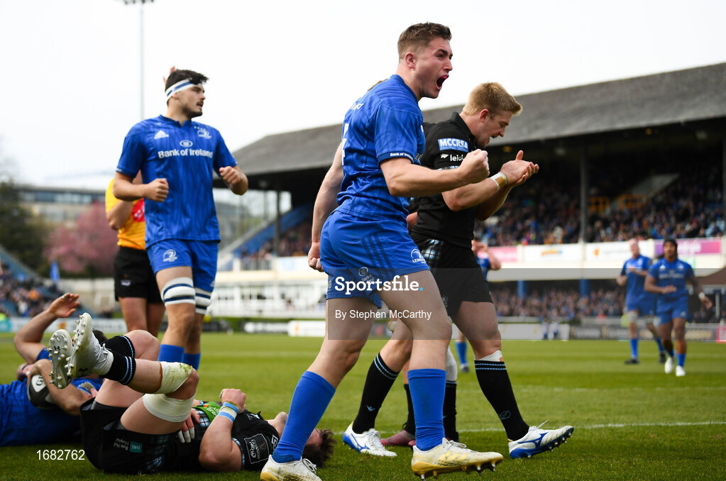 13 April 2019; Jordan Larmour celebrates after his Leinster team-mate Dave Kearney scored their side's fourth try during the Guinness PRO14 Round 20 match between Leinster and Glasgow Warriors at the RDS Arena in Dublin. Photo by Stephen McCarthy/Sportsfile