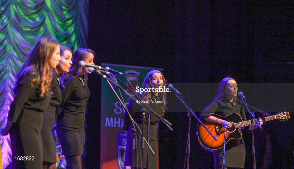 13 April 2019; Leinster team Niamh Delaney, Valene Greer, Sarah Kenny, Zoe Rooney and Avril Spain from Ferbane, Offaly, competing in the Bailéad Ghrúpa catagory during the Scór Sinsir All Ireland Finals at the TF Royal hotel and theatre, Old Westport road in Castlebar, Co Mayo. Photo by Eóin Noonan/Sportsfile
