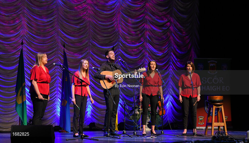 13 April 2019; Ulster team Monica Mallon, Orla Treanor, Geralding McLoughlin, Blanaid McGivern and Stephen Murphy from Carrickcruppen, Armagh, competing in the Bailéad Ghrúpa catagory during the Scór Sinsir All Ireland Finals at the TF Royal hotel and theatre, Old Westport road in Castlebar, Co Mayo. Photo by Eóin Noonan/Sportsfile