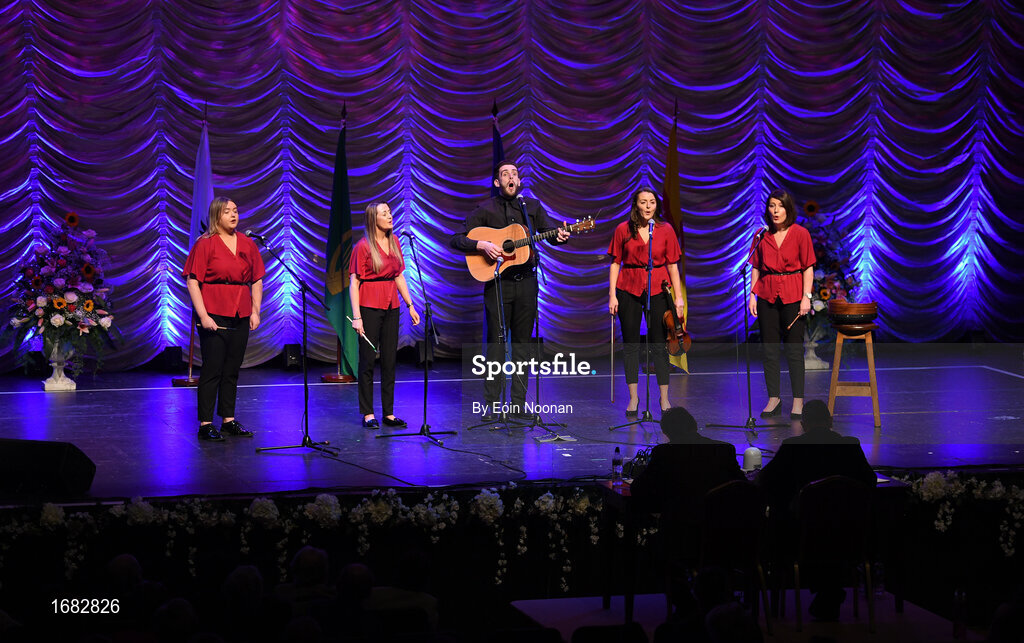 13 April 2019; Ulster team Monica Mallon, Orla Treanor, Geralding McLoughlin, Blanaid McGivern and Stephen Murphy from Carrickcruppen, Armagh, competing in the Bailéad Ghrúpa catagory during the Scór Sinsir All Ireland Finals at the TF Royal hotel and theatre, Old Westport road in Castlebar, Co Mayo. Photo by Eóin Noonan/Sportsfile