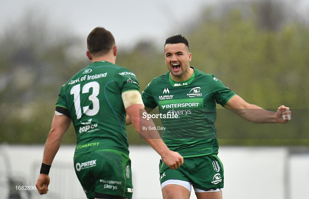 13 April 2019; Cian Kelleher, right, and Tom Farrell of Connacht celebrate their side's victory following the Guinness PRO14 Round 20 match between Connacht and Cardiff Blues at The Sportsground in Galway. Photo by Seb Daly/Sportsfile
