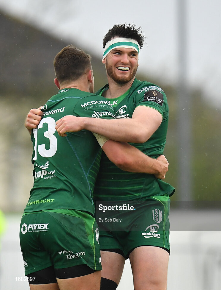 13 April 2019; Tom Daly, right, and Tom Farrell of Connacht celebrate their side's victory following the Guinness PRO14 Round 20 match between Connacht and Cardiff Blues at The Sportsground in Galway. Photo by Seb Daly/Sportsfile