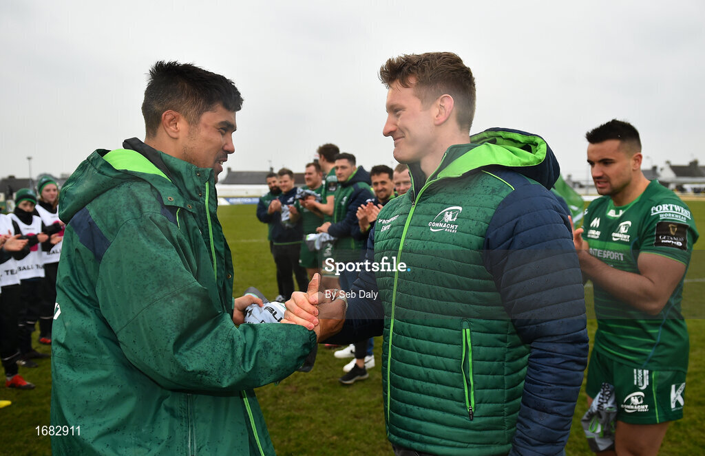 13 April 2019; Eoin Griffin of Connacht, right, is presented with a shirt by captain Jarrad Butler following the Guinness PRO14 Round 20 match between Connacht and Cardiff Blues at The Sportsground in Galway. Photo by Seb Daly/Sportsfile