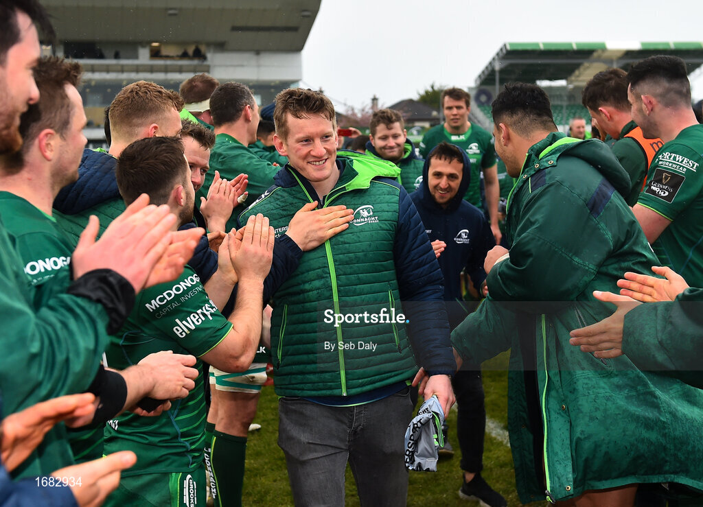 13 April 2019; Eoin Griffin is congratulated by team-mates as he leaves the field following the Guinness PRO14 Round 20 match between Connacht and Cardiff Blues at The Sportsground in Galway. Photo by Seb Daly/Sportsfile