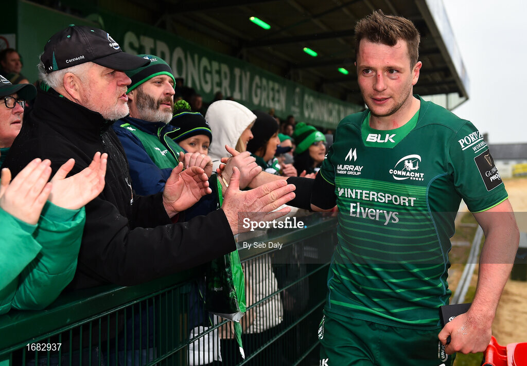 13 April 2019; Jack Carty of Connacht with supporters following the Guinness PRO14 Round 20 match between Connacht and Cardiff Blues at The Sportsground in Galway. Photo by Seb Daly/Sportsfile