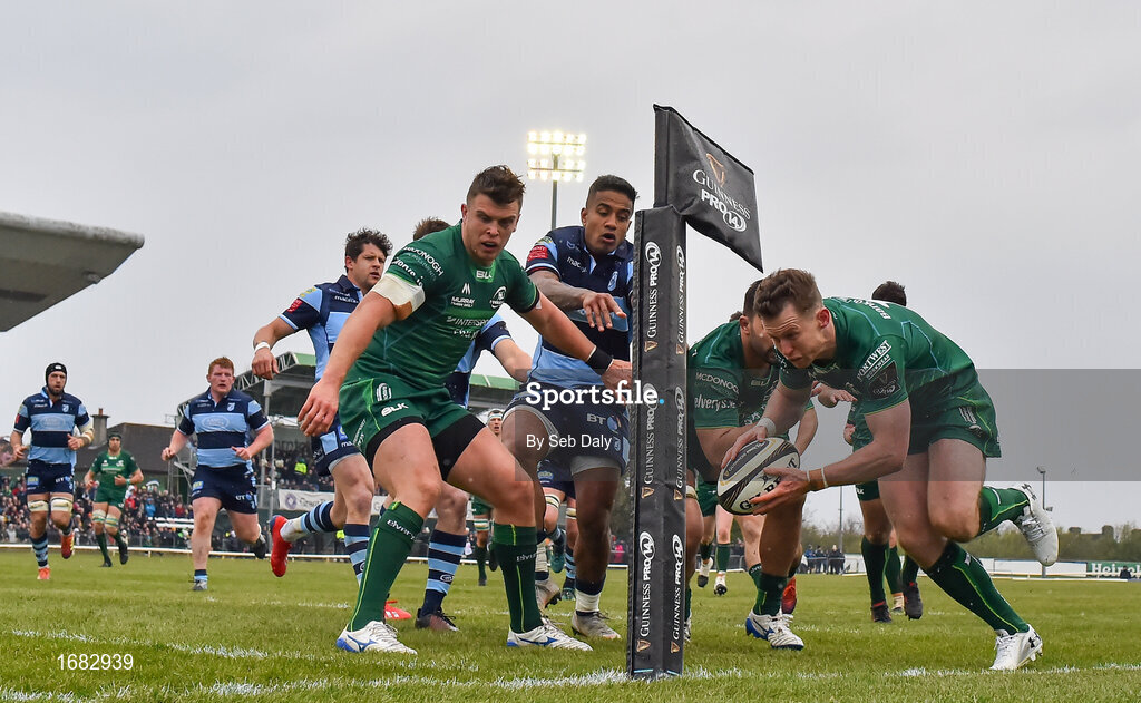 13 April 2019; Matt Healy of Connacht goes over to score his side's fourth try during the Guinness PRO14 Round 20 match between Connacht and Cardiff Blues at The Sportsground in Galway. Photo by Seb Daly/Sportsfile
