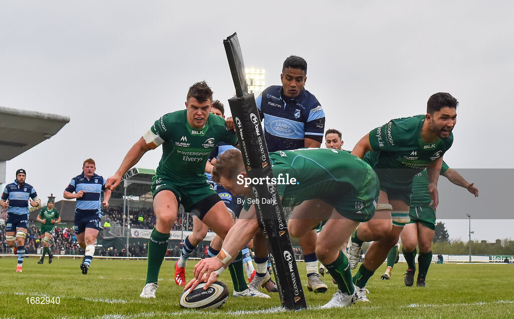 13 April 2019; Matt Healy of Connacht goes over to score his side's fourth try during the Guinness PRO14 Round 20 match between Connacht and Cardiff Blues at The Sportsground in Galway. Photo by Seb Daly/Sportsfile