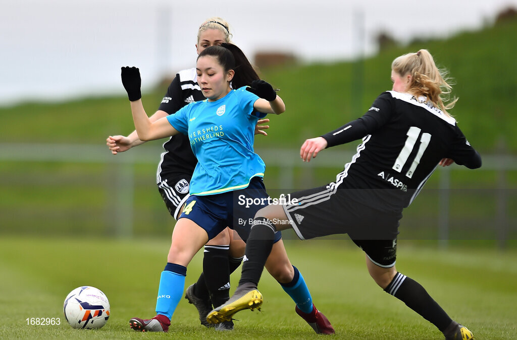 13 April 2019; Niamh Murphy of DLR Waves in action against Nathalie O'Brien, behind, and Eabha O'Mahony of Cork City during the Só Hotels Women's National League match between DLR Waves and Cork City FC at Jackson Park in Kilternan, Dublin. Photo by Ben McShane/Sportsfile