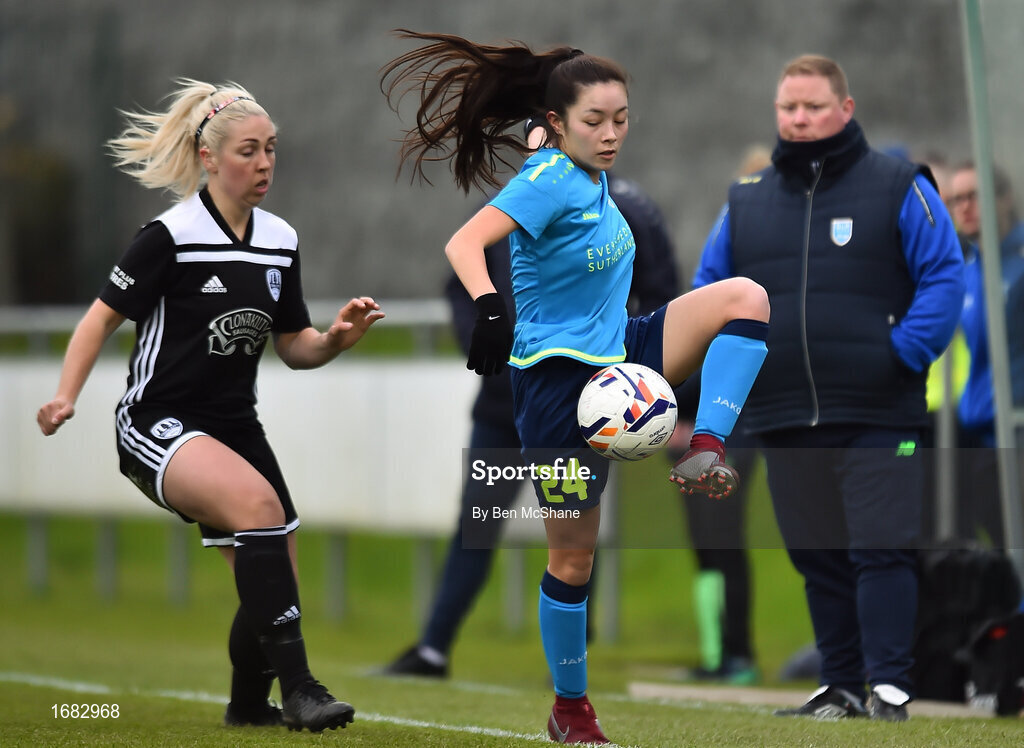 13 April 2019; Niamh Murphy of DLR Waves in action against Nathalie O'Brien of Cork City during the Só Hotels Women's National League match between DLR Waves and Cork City FC at Jackson Park in Kilternan, Dublin. Photo by Ben McShane/Sportsfile