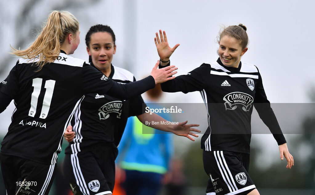 13 April 2019; Katie McCarthy, right, of Cork City celebrates after scoring her side's first goal with team-mates Lauren Egbuloniu, centre, and Eabha O'Mahony, 11, during the Só Hotels Women's National League match between DLR Waves and Cork City FC at Jackson Park in Kilternan, Dublin. Photo by Ben McShane/Sportsfile