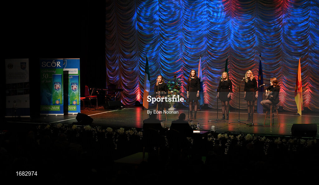 13 April 2019; Munster team Rachel Hodnett Rachel O’Sullivan, Aine Fitzgerald, Ashlie O’Sullivan and Amy O’Sullivan from St. James, Cork, competing in the Bailéad Ghrúpa catagory during the Scór Sinsir All Ireland Finals at the TF Royal hotel and theatre, Old Westport road in Castlebar, Co Mayo. Photo by Eóin Noonan/Sportsfile