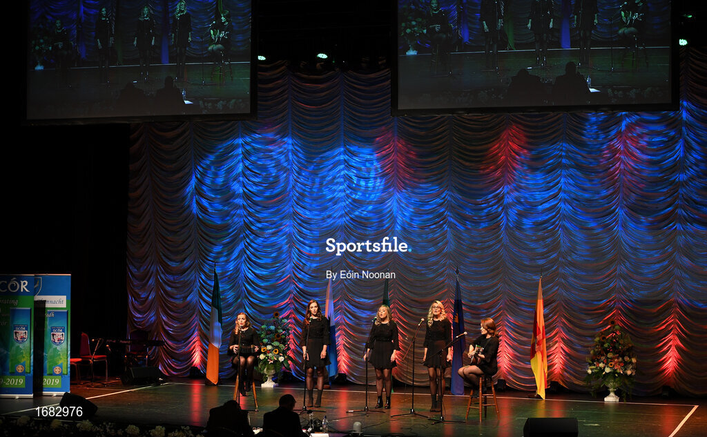 13 April 2019; Munster team Rachel Hodnett Rachel O’Sullivan, Aine Fitzgerald, Ashlie O’Sullivan and Amy O’Sullivan from St. James, Cork, competing in the Bailéad Ghrúpa catagory during the Scór Sinsir All Ireland Finals at the TF Royal hotel and theatre, Old Westport road in Castlebar, Co Mayo. Photo by Eóin Noonan/Sportsfile