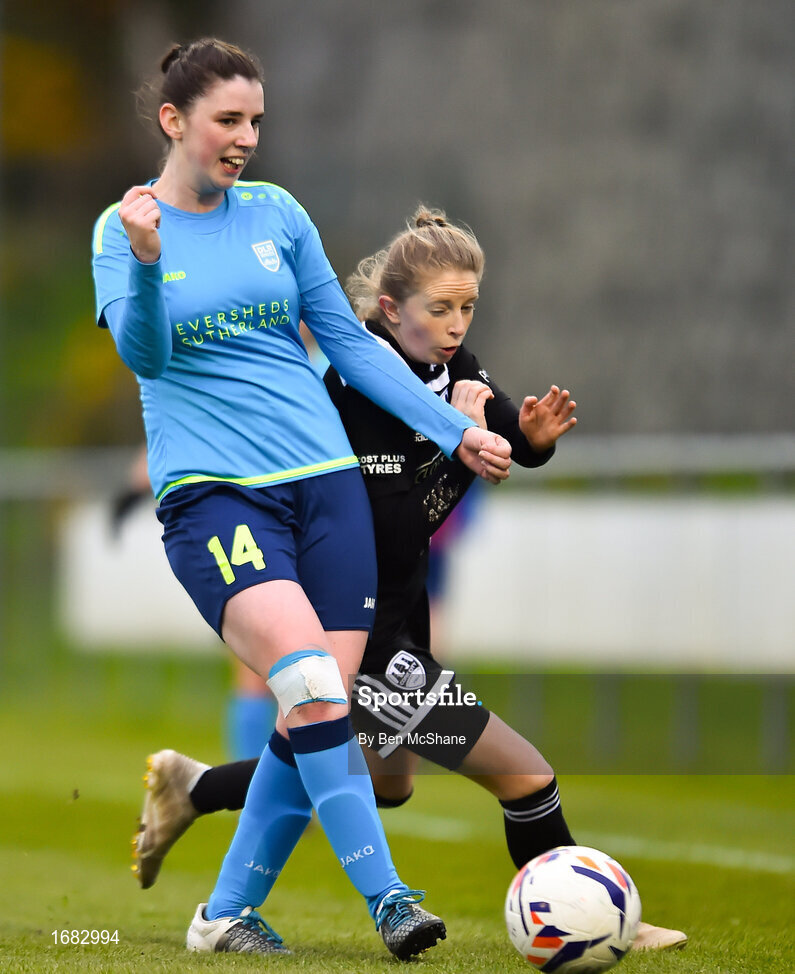 13 April 2019; Sinead Gaynor of DLR Waves in action against Katie McCarthy of Cork City during the Só Hotels Women's National League match between DLR Waves and Cork City FC at Jackson Park in Kilternan, Dublin. Photo by Ben McShane/Sportsfile