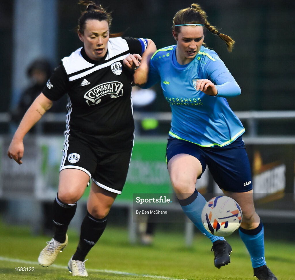 13 April 2019; Roisin McGovern of DLR Waves in action against Maggie Duncliffe of Cork City during the Só Hotels Women's National League match between DLR Waves and Cork City FC at Jackson Park in Kilternan, Dublin. Photo by Ben McShane/Sportsfile