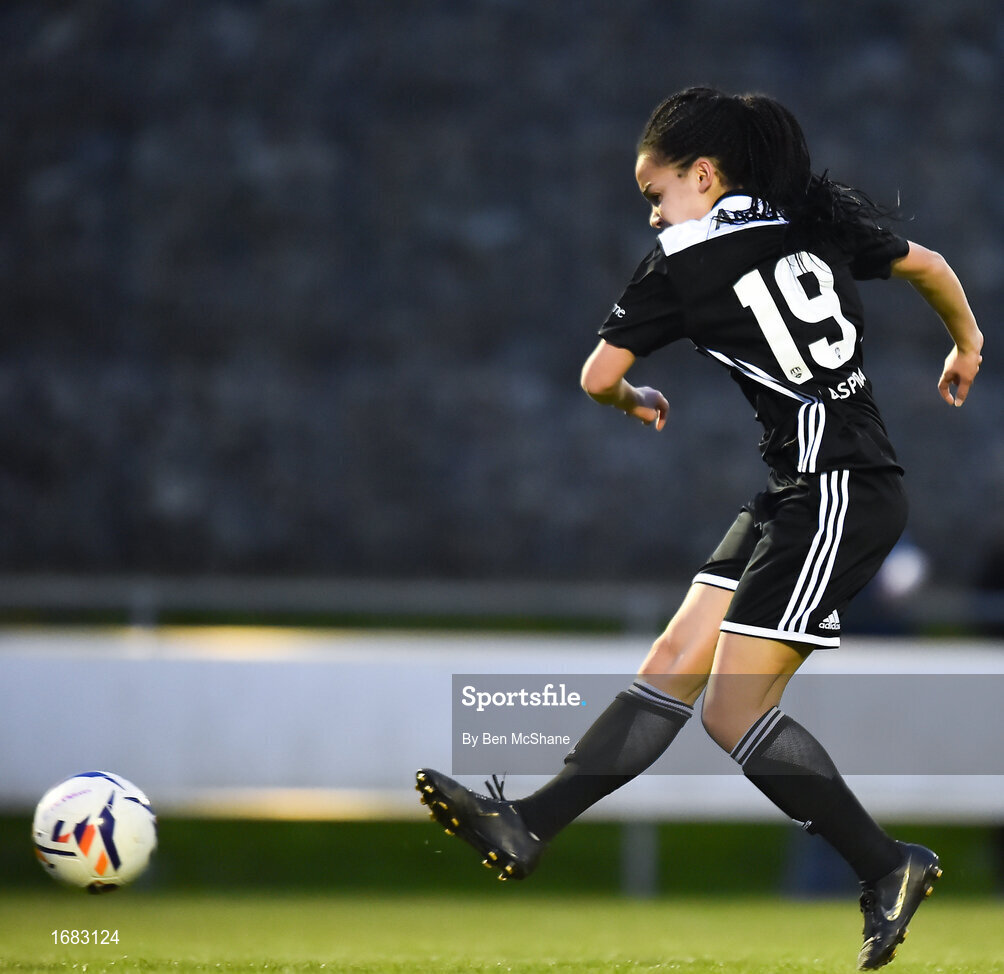 13 April 2019; Lauren Egbuloniu of Cork City shoots to score her side's second goal during the Só Hotels Women's National League match between DLR Waves and Cork City FC at Jackson Park in Kilternan, Dublin. Photo by Ben McShane/Sportsfile