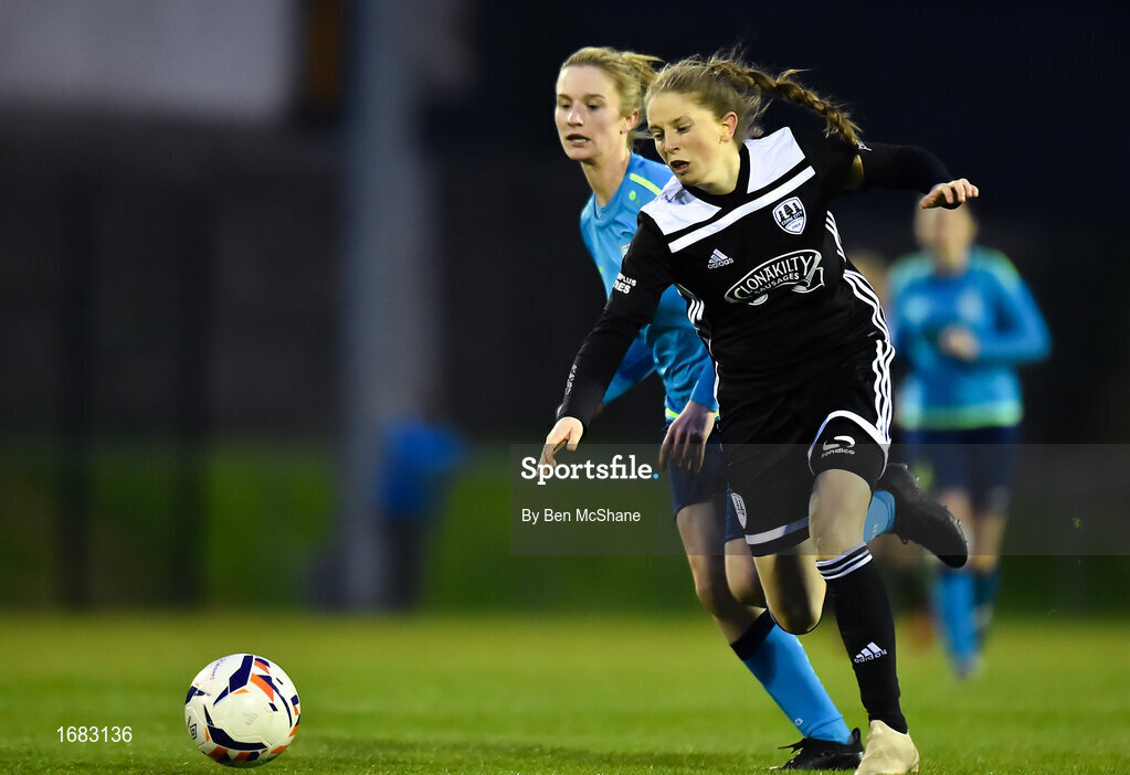 13 April 2019; Katie McCarthy of Cork City in action against Jenny O'Keeffe of DLR Waves during the Só Hotels Women's National League match between DLR Waves and Cork City FC at Jackson Park in Kilternan, Dublin. Photo by Ben McShane/Sportsfile