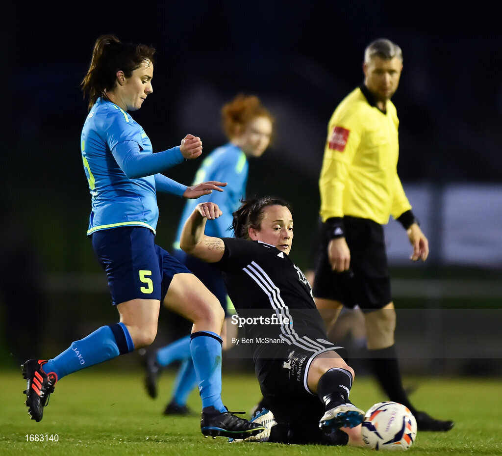 13 April 2019; Maggie Duncliffe of Cork City wins possession from Ally O'Keeffe of DLR Waves during the Só Hotels Women's National League match between DLR Waves and Cork City FC at Jackson Park in Kilternan, Dublin. Photo by Ben McShane/Sportsfile