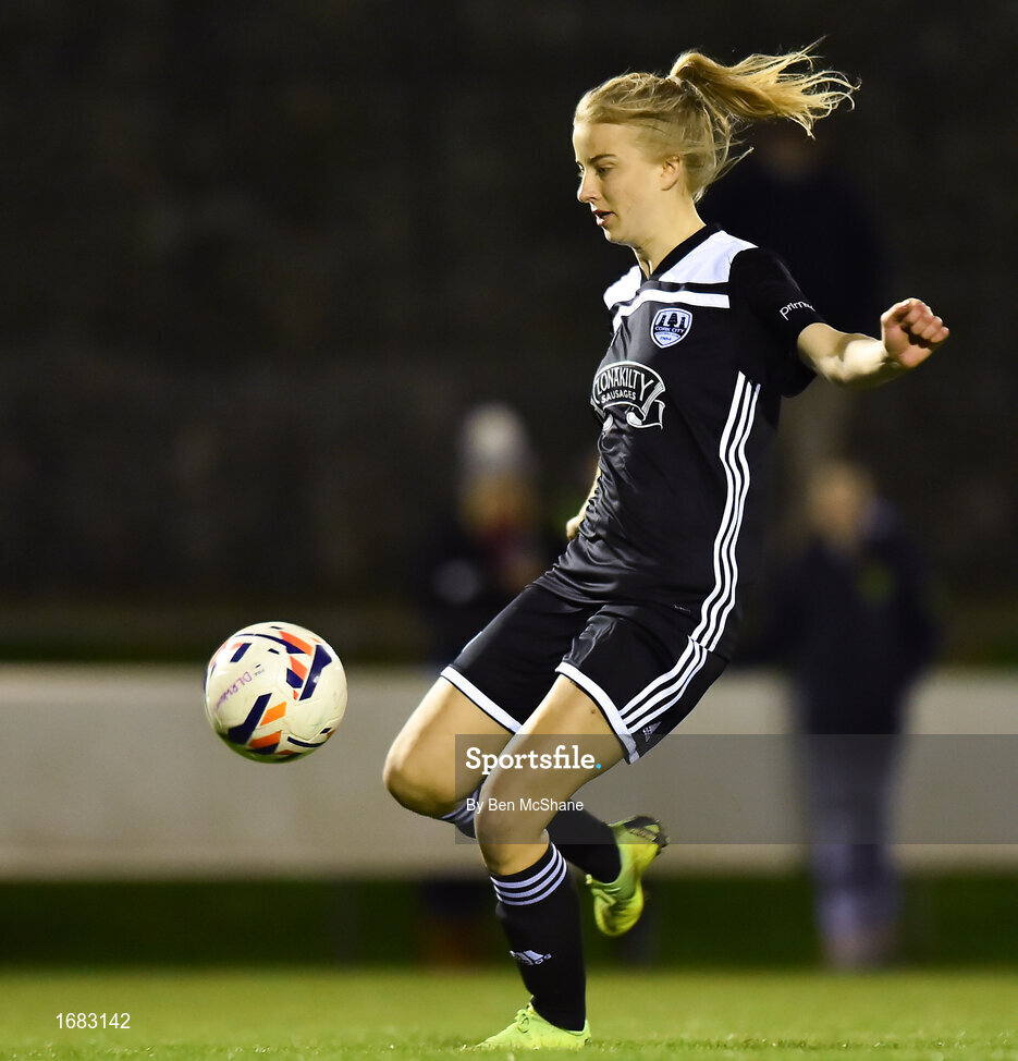 13 April 2019; Christina Dring of Cork City shoots to score her side's third goal during the Só Hotels Women's National League match between DLR Waves and Cork City FC at Jackson Park in Kilternan, Dublin. Photo by Ben McShane/Sportsfile