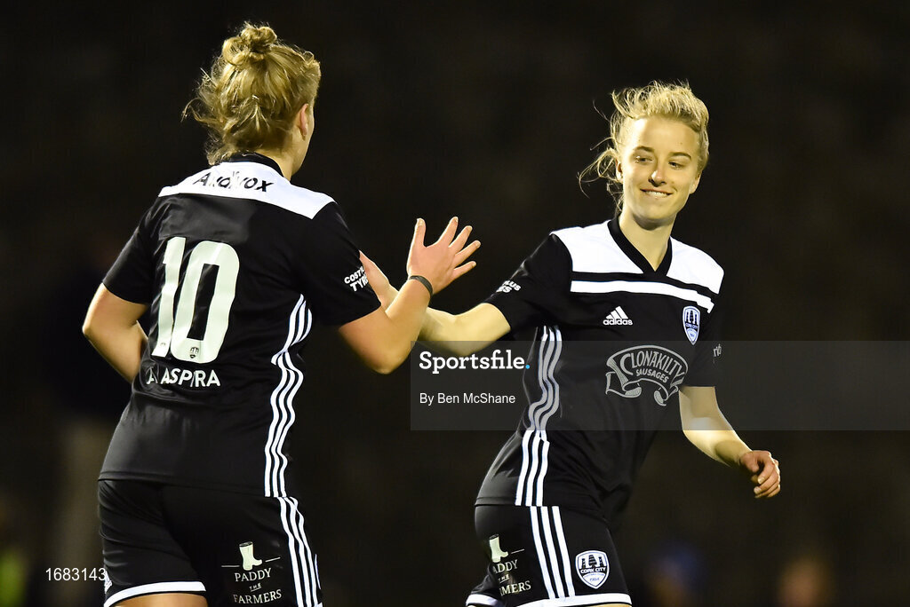 13 April 2019; Christina Dring of Cork City celebrates after scoring her side's third goal with team-mate Saoirse Noonan during the Só Hotels Women's National League match between DLR Waves and Cork City FC at Jackson Park in Kilternan, Dublin. Photo by Ben McShane/Sportsfile